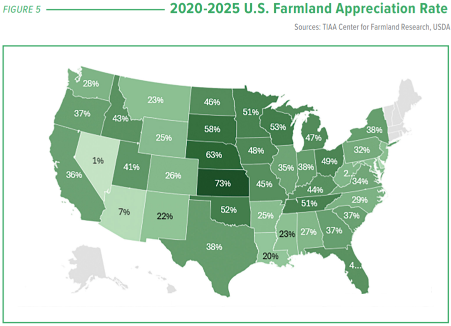 Over the period 2020-2025, farmland values have risen strongly across the USA with Kansas, Nebraska, and South Dakota values alone increasing by 73%, 63%, and 58% respectively. See graphic below.